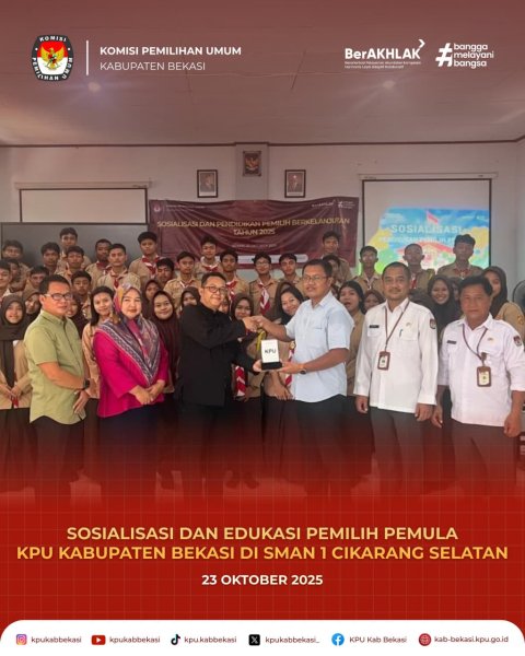 Sosialisasi Pendidikan Pemilih Pemula kali ini diselenggarakan di SMAN 1 Cikarang Selatan nih, #TemanPemilih! (23/10)