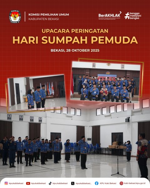 #TemanPemilih Ikrar Sumpah Pemuda dideklarasikan pada tanggal 28 Oktober tahun 1928. Peristiwa tersebut menjadi fondasi perjuangan kemerdekaan Indonesia serta simbol persatuan nasional. Oleh karena itu, pada hari ini KPU Kabupaten Bekasi turut memperingati Hari Sumpah Pemuda ke-97 tahun 2025 dengan melaksanakan upacara. Upacara yang dipimpin oleh Anggota KPU Kabupaten Bekasi (Muchamad Iqbal) dan para peserta upacara yang terdiri dari seluruh staf sekretariat KPU Kabupaten Bekasi berlangsung dengan khidmat.