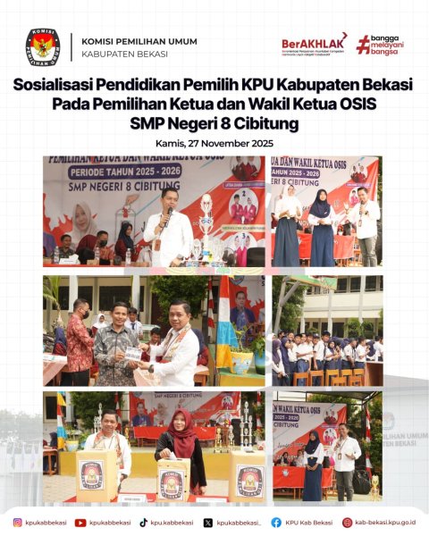KPU Kabupaten Bekasi hadir di SMP Negeri 8 Cibitung dalam rangka Sosialisasi dan Pendidikan Pemilih Pemula kepada seluruh siswa SMP Negeri 8 Cibitung (27/11).