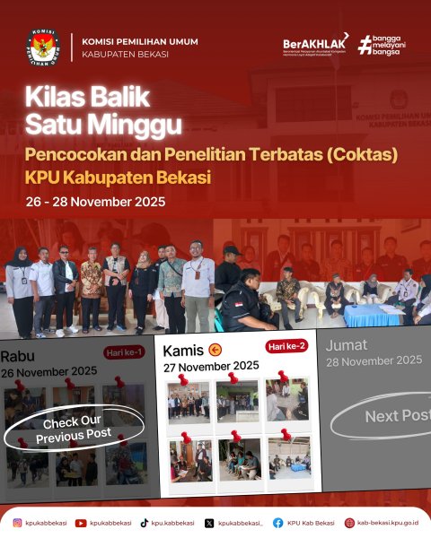 Kegiatan Pencocokkan dan Penelitian Terbatas (Coktas) KPU Kabupaten Bekasi hari kedua dilaksanakan pada tanggal 27 November 2025.