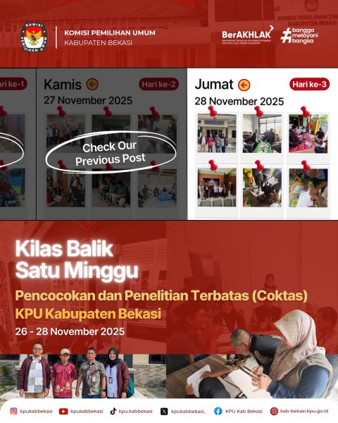 Seperti sebelumnya, para petugas mencocokkan data ke berbagai wilayah di Kabupaten Bekasi dengan tujuan memastikan data yang dimiliki oleh KPU Kabupaten Bekasi benar dengan data yang ada di lapangan. Hari ketiga pelaksanaan Coktas yang sekaligus hari terakhir ini berjalan dengan lancar dan tidak ada kesulitan yang berarti.