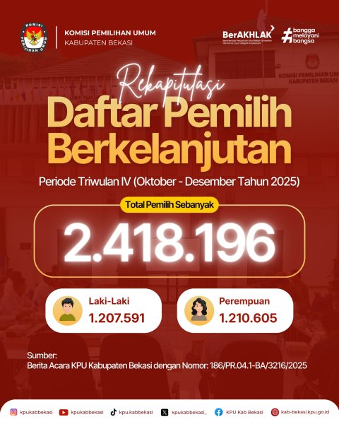 Berikut adalah hasil dari Pemutakhiran Data Pemilih Berkelanjutan Periode Triwulan IV Tahun 2025 Kabupaten Bekasi yang dimutakhirkan selama tiga bulan sekali oleh KPU Kabupaten Bekasi.