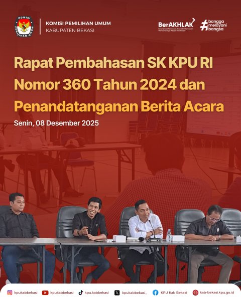 KPU Kabupaten Bekasi melaksanakan Rapat Tindak Lanjut Rapat Koordinasi Pembahasan Surat Keputusan KPU RI Nomor 360 Tahun 2024 yang telah dilaksanakan pada hari Rabu, 03 Desember 2025 (08/12).