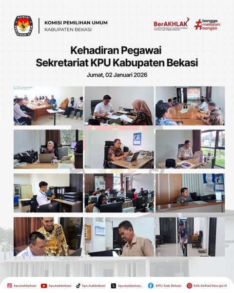 Berikut kondisi kesekretariatan KPU Kabupaten Bekasi pada hari Jumat, 2 Januari 2026. Terpantau Sekretaris, Kasubbag, dan staf sekretariat hadir dan beraktivitas seperti biasa pada hari ini (02/01).