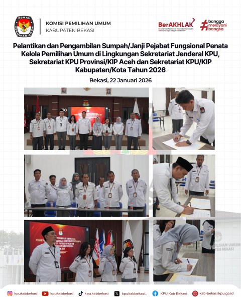 Pada hari Kamis, KPU Kabupaten Bekasi mengikuti acara Pelantikan dan Pengambilan Sumpah/Janji Pejabat Fungsional di Lingkungan Sekretariat Jenderal KPU/Sekretariat KPU Provinsi/KIP Aceh dan Sekretariat KPU Kabupaten/Kota Tahun 2026 (22/01).