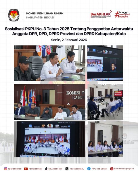 #TemanPemilih Pada hari Senin, KPU Kabupaten Bekasi melaksanakan kegiatan Sosialisasi PKPU Nomor 3 Tahun 2025 tentang Penggantian Antarwaktu Anggota Dewan Perwakilan Rakyat, Dewan Perwakilan Daerah, Dewan Perwakilan Rakyat Daerah Provinsi, dan Dewan Perwakilan Rakyat Daerah Kabupaten/Kota (02/02).