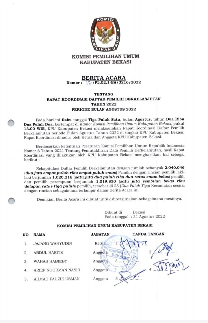 Berikut disampaikan Berita Acara Nomor 17/PL.02.1-BA/3216/2022 tanggal 31 Agustus 2022 tentang Rapat Koordinasi Daftar Pemilih Berkelanjutan Tahun 2022.