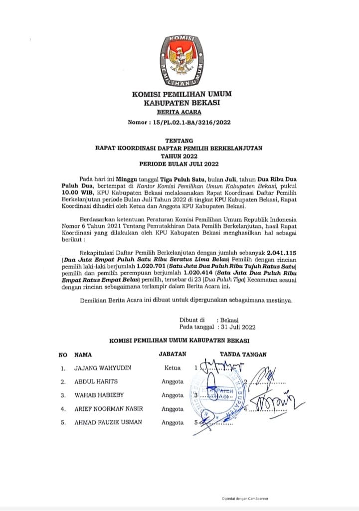 Berikut ini diumumkan Berita Acara Nomor : 15/PL.02.1-BA/3216/2022 tanggal 31 Juli 2022 tentang Rapat Koordinasi Daftar Pemilih Berkelanjutan (DPB) Bulan Juli 2022.