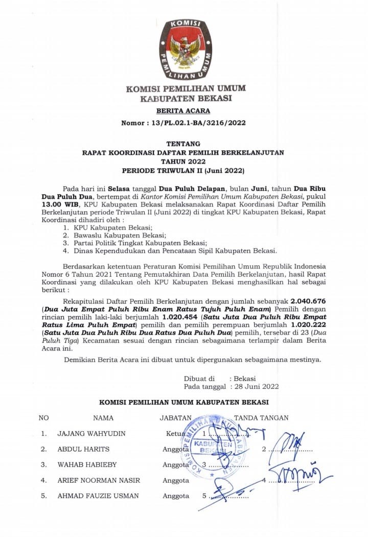 Berita Acara Nomor 13/PL.02.1-BA/3216/2022 tanggal 28 Juni 2022 tentang Rapat Koordinasi Daftar Pemilih Belanjutan (DPB) tahun 2022 Periode Triwulan II (Juni 2022)