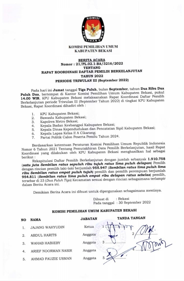 Berikut disampaikan Berita Acara KPU Kabupaten Bekasi Nomor 21/PL.02.1-BA/3216/2022 Tanggal 30 September 2022 Tentang Daftar Pemilih Berkelanjutan Periode Triwulan III Tahun 2022 (September 2022). [Red]