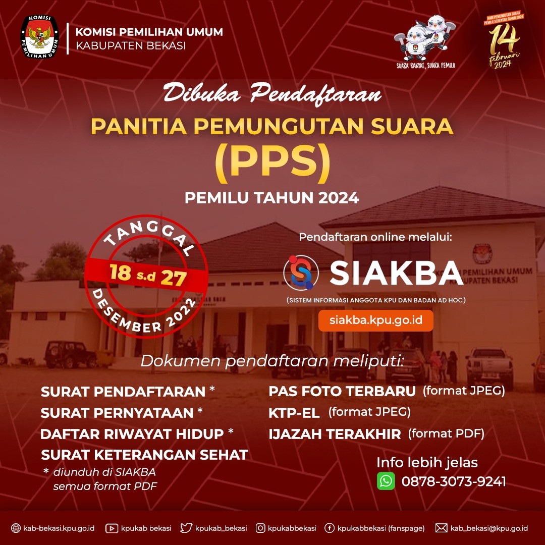 Bekasi, kab-bekasi.kpu.go.id – Komisi Pemilihan Umum (KPU) Kabupaten Bekasi membuka pendaftaran calon anggota Panitia Pemungutan Suara (PPS) untuk Pemilihan Umum Tahun 2024. Pendaftaran dilakukan secara online melalui https://siakba.kpu.go.id/ mulai tanggal 18 sampai 27 Desember 2022.UNDUH PENGUMUMAN DISINI