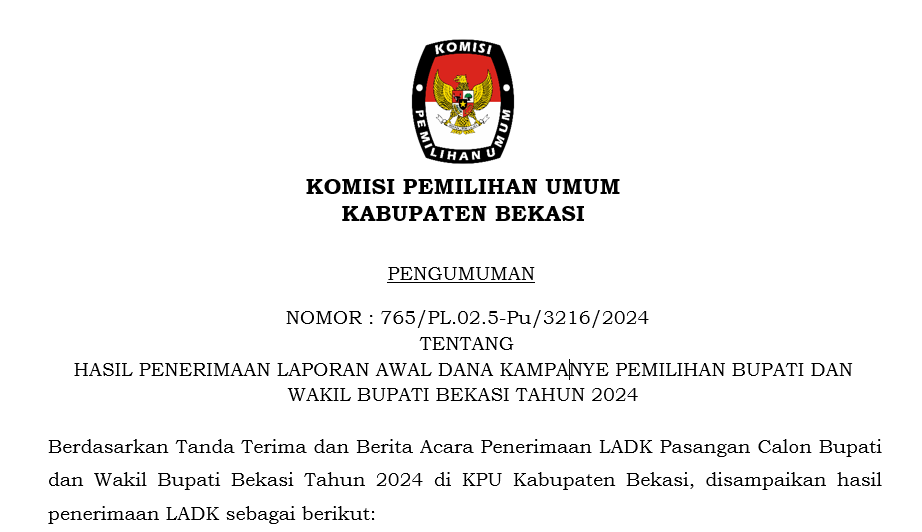 HASIL PENERIMAAN LAPORAN AWAL DANA KAMPANYE PEMILIHAN BUPATI DAN WAKIL BUPATI BEKASI TAHUN 2024