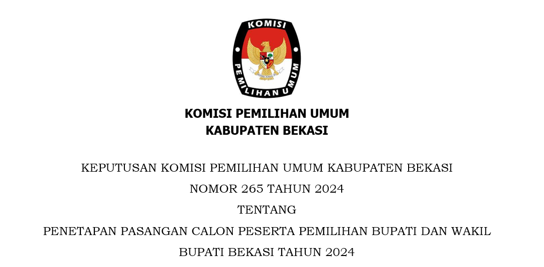 KEPUTUSAN KOMISI PEMILIHAN UMUM KABUPATEN BEKASI NOMOR 265 TAHUN 2024 TENTANG PENETAPAN PASANGAN CALON PESERTA PEMILIHAN BUPATI DAN WAKIL BUPATI BEKASI TAHUN 2024 Minggu, 22 September 2024 07:00 178 Pengumuman selengkapnya unduh disini Bagikan: Dilihat 178 Kali.