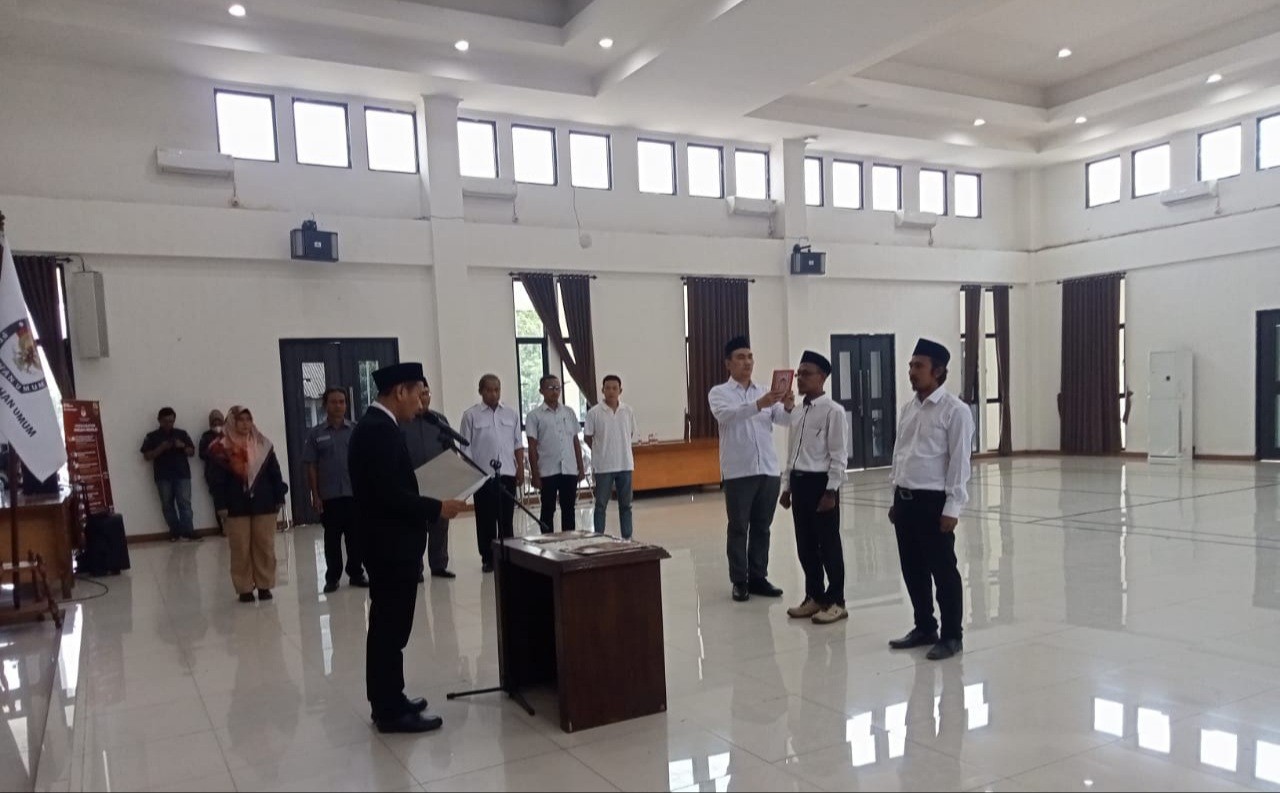 Pelantikan berlangsung di Ballroom KPU Kabupaten Bekasi disaksikan oleh anggota KPU Kabupaten Bekasi Abdul Harits dan Wahab Habieby serta anggota Bawaslu Kabupaten Bekasi, Aan Hasanah dan Syahroji.