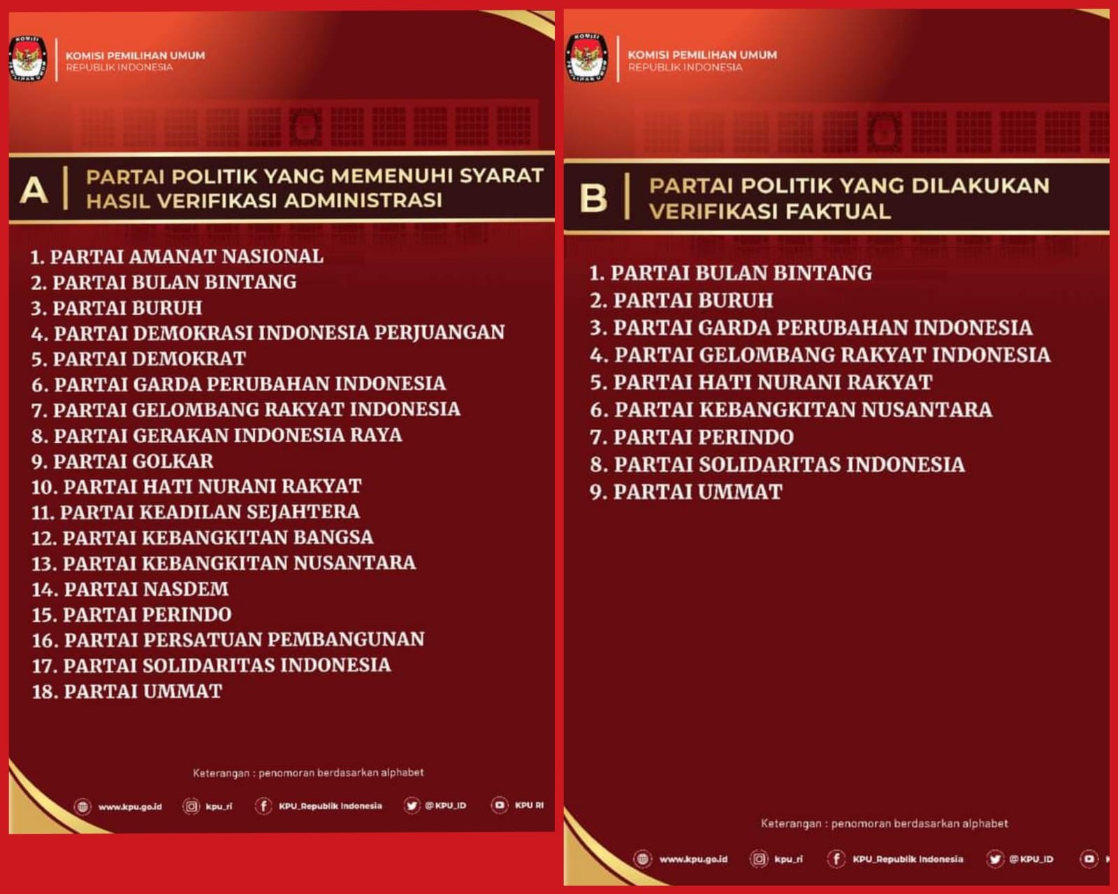 Kesembilan parpol tersebut adalah Partai Gelombang Rakyat Indonesia (Gelora), Partai Solidaritas Indonesia (PSI), Partai Buruh, Partai Ummat, Partai Hati Nurani Rakyat (Hanura), Partai Kebangkitan Nusantara (PKN), Partai Gerakan Perubahan Indonesia (Garuda), Partai Bulan Bintang (PBB) dan Partai Persatuan Indonesia (Perindo).