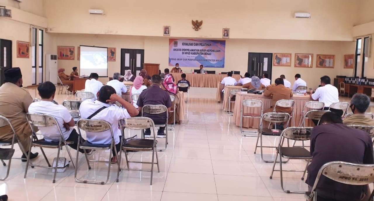 CIKARANG, kab-bekasi.kpu.go.id - Dinas Arsip dan Perpustakaan (Disarpus) Kabupaten Bekasi dan Komisi Pemilihan Umum (KPU) Kabupaten Bekasi mengadakan Sosialisasi dan Pelatihan Akuisisi Penyelamatan Arsip Kepemiluan di Kabupaten Bekasi, Senin (14/6/2021).