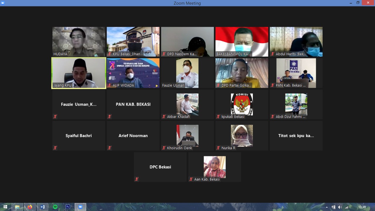 Rapat koordinasi dilakukan secara virtual melibatkan Bawaslu Kabupaten Bekasi, Disdukcapil, Bakesbangpol dan perwakilan partai politik, diantaranya tampak terlihat fungsionaris Golkar, PAN, Nasdem dan PBB tingkat Kabupaten Bekasi.