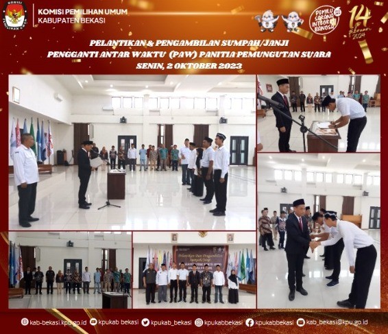 Bekasi, kab-bekasi.kpu.go.id_Ketua KPU Kabupaten Bekasi melantik empat orang pengganti antar waktu (PAW) Panitia Pemungutan Suara (PPS) Pemilu 2024 di Ballroom Kantor KPU Kabupaten Bekasi, Senin (2/10/2023).