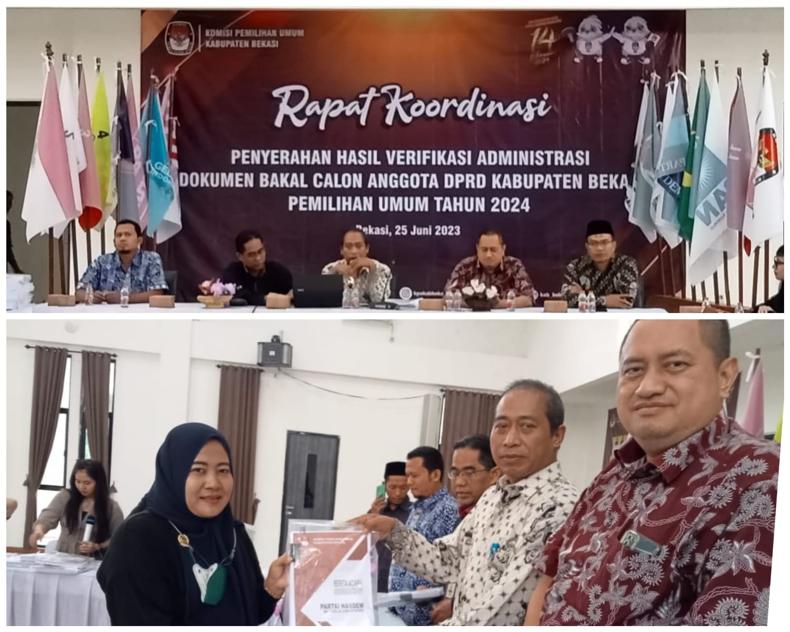 Bekasi, kab-bekasi.kpu.go.id_Komisi Pemilihan Umum (KPU) Kabupaten Bekasi menyerahkan Hasil Verifikasi Administrasi Dokumen Persyaratan Bakal Calon Anggota DPRD Kabupaten Bekasi untuk Pemilihan Umum Tahun 2024 kepada Partai Politik Peserta Pemilu pada Minggu (25/6/2023).