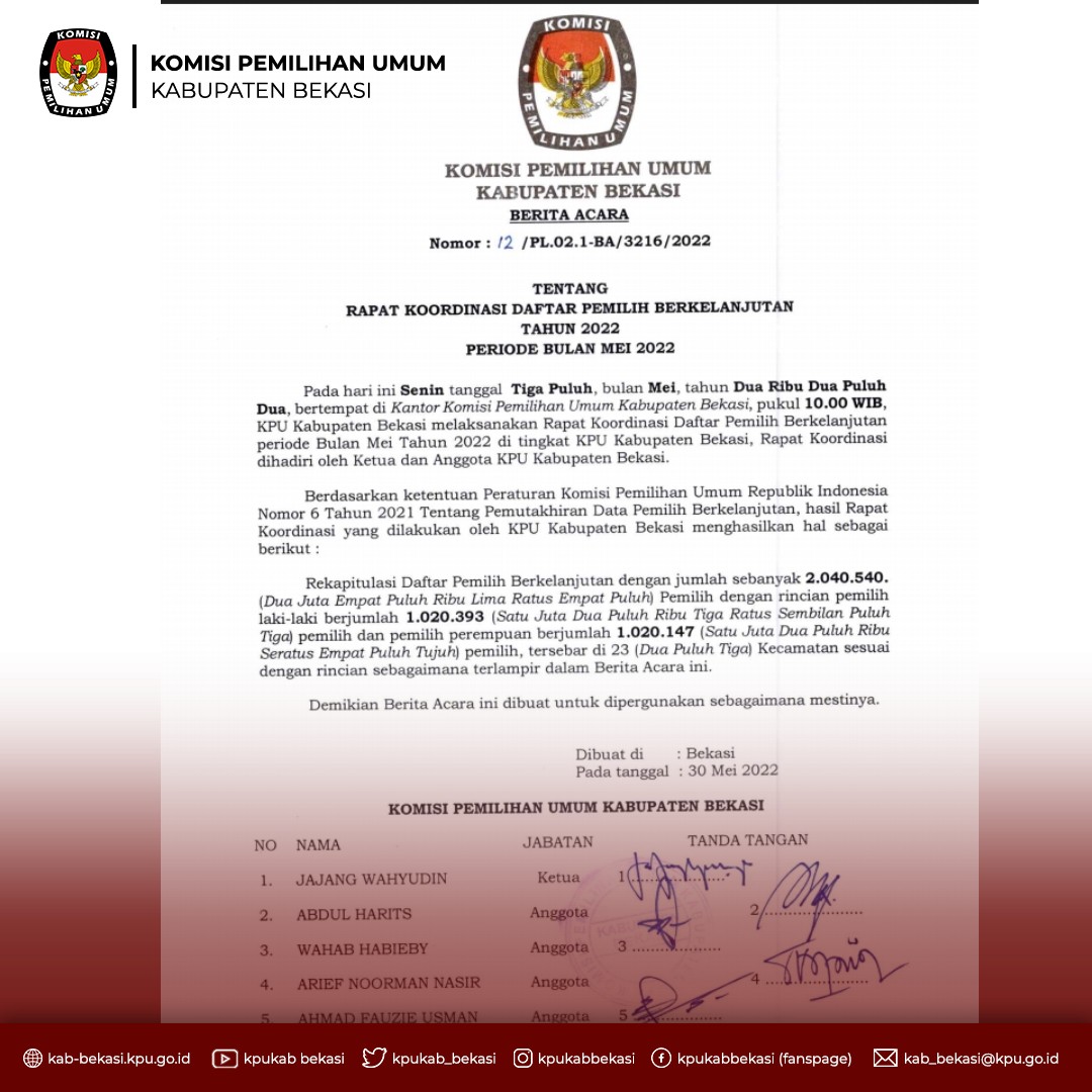 BEKASI, kab-bekasi.kpu.go.id - Komisi Pemilihan Umum (KPU) Kabupaten Bekasi menetapkan Daftar Pemilih Berkelanjutan (DPB) periode Mei 2022 berjumlah 2.040.540, terdiri dari pemilih laki-laki 1.020.393 dan perempuan 1.020.147 pemilih.