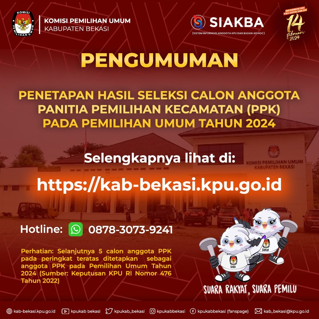 Bekasi, kab-bekasi.kpu.go.id – Komisi Pemilihan Umum (KPU) Kabupaten Bekasi, Rabu (14/12/2022) mengumumkan hasil seleksi calon anggota Panitia Pemilihan Kecamatan (PPK) yang akan bertugas pada Pemilihan Umum Tahun 2024.
