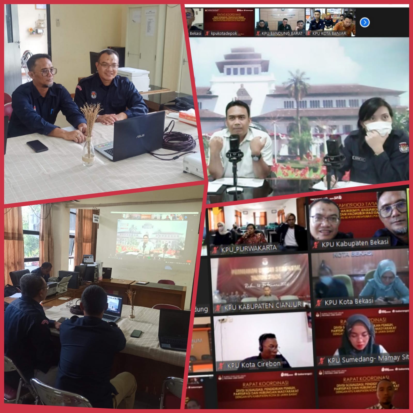 Rakor digelar secara virtual dipimpin oleh Reza Alwan Sovnidar selaku Kadiv Sosdiklih dan Parmas KPU Provinsi Jawa Barat didampingi Kabag Teknis dan Hubungan Masyarakat, Sophia Kurniasari Purba.