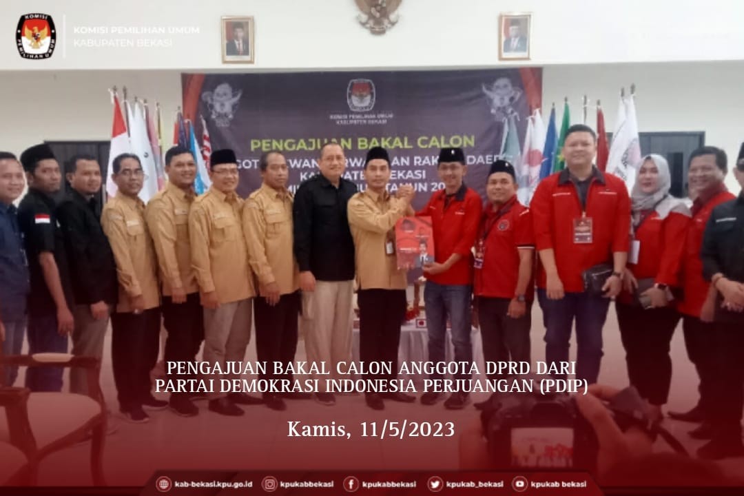 Bekasi, kab-bekasi.kpu.go.id_ DPC Partai Demokrasi Indonesia Perjuangan (PDIP) Kabupaten Bekasi menyampaikan pengajuan bakal calon anggota DPRD Kabupaten Bekasi untuk Pemilihan Umum Tahun 2024 ke KPU Kabupaten Bekasi pada Kamis (11/5/2023) pukul 10.00 WIB.