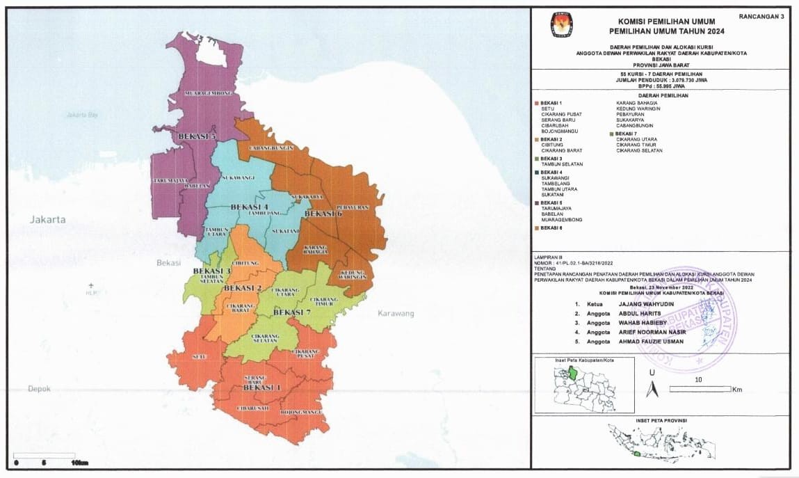 Bekasi, kab-bekasi.kpu.go.id – Komisi Pemilihan Umum (KPU) telah menerbitkan Peraturan KPU Nomor 6 Tahun 2023 tentang Daerah Pemilihan dan Alokasi Kursi Anggota Dewan Perwakilan Rakyat, Dewan Perwakilan Rakyat Daerah Provinsi, dan Dewan Perwakilan Rakyat Daerah Kabupaten/Kota Dalam Pemilihan Umum Tahun 2024.