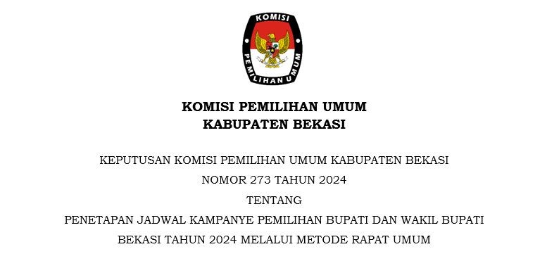 PENETAPAN JADWAL KAMPANYE PEMILIHAN BUPATI DAN WAKIL BUPATI BEKASI TAHUN 2024 MELALUI METODE RAPAT UMUM Jumat, 18 Oktober 2024 07:00 1042 Selengkapnya download disini Bagikan: Dilihat 1,042 Kali.