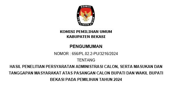 PENGUMUMAN HASIL PENELITIAN PERSYARATAN ADMINISTRASI CALON, SERTA MASUKAN DAN TANGGAPAN MASYARAKAT ATAS PASANGAN CALON BUPATI DAN WAKIL BUPATI BEKASI PADA PEMILIHAN TAHUN 2024