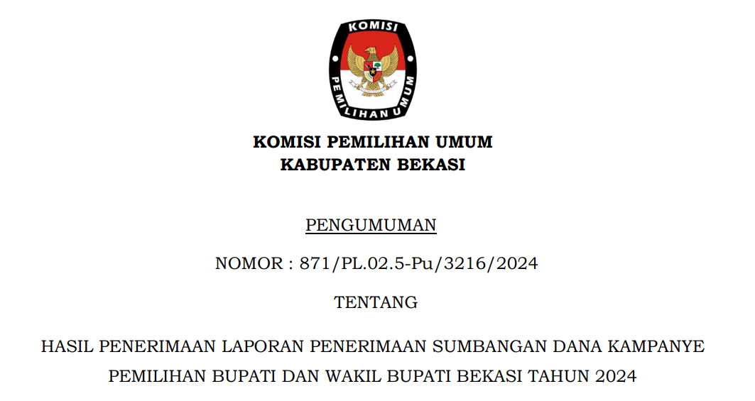 PENGUMUMAN HASIL PENERIMAAN LAPORAN PENERIMAAN SUMBANGAN DANA KAMPANYE PEMILIHAN BUPATI DAN WAKIL BUPATI BEKASI TAHUN 2024