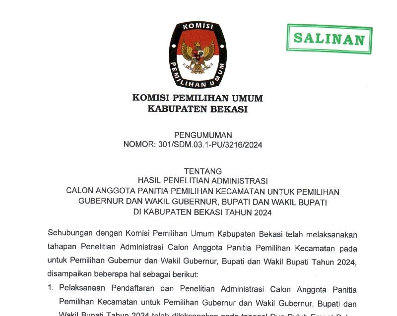PENGUMUMAN HASIL SELEKSI ADMINISTRASI CALON ANGGOTA PANITIA PEMILIHAN KECAMATAN PADA PEMILIHAN GUBERNUR DAN WAKIL GUBERNUR SERTA BUPATI DAN WAKIL BUPATI BEKASI PADA PILKADA TAHUN 2024 Sabtu, 04 Mei 2024 07:00 506 Pengumuman selengkapnya download disini: >>>> Bagikan: Dilihat 506 Kali.