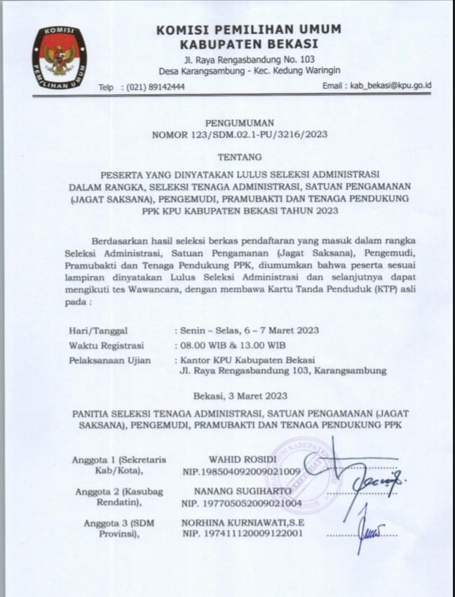 TENTANG PESERTA YANG DINYATAKAN LULUS SELEKSI ADMINISTRASI DALAM RANGKA SELEKSI TENAGA ADMINISTRASI, SATUAN PENGAMANAN (JAGAT SAKSANA), PENGEMUDI, PRAMUBAKTI DAN TENAGA PENDUKUNG PANITIA PEMILIHAN KECAMATAN (PPK) KPU KABUPATEN BEKASI TAHUN 2023