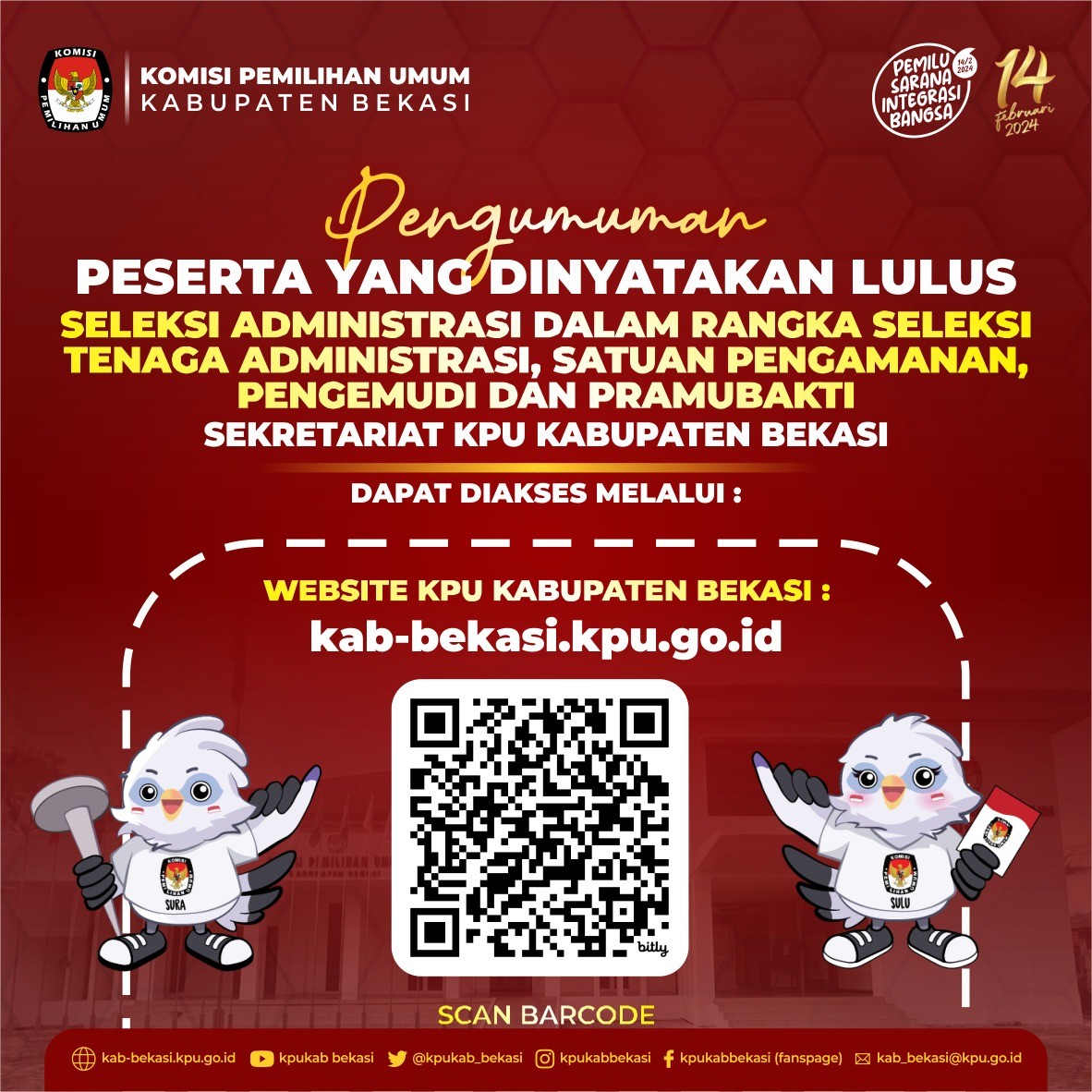 BERIKUT TERLAMPIR PENGUMUMAN HASIL SELEKSI ADMINISTRA DALAM RANGKA SELEKSI TENAGA ADMINISTRASI, SATUAN PENGAMANAN JAGAT SAKSANA, PENGEMUDI, DAN PRAMUBAKTI DI LINGKUNGAN SEKRETARIAT KPU KABUPATEN BEKASI
