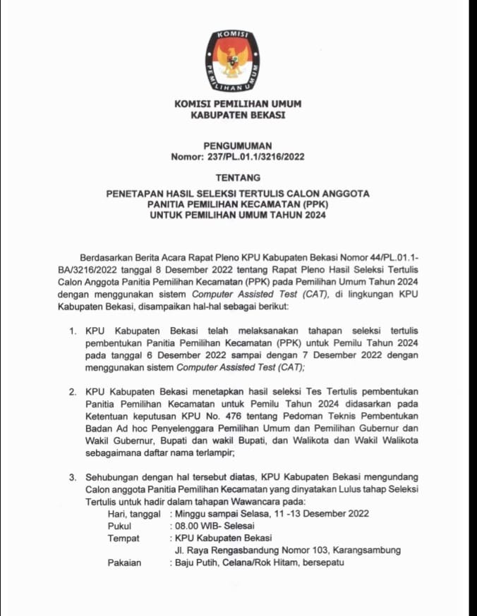 Berdasarkan Berita Acara Rapat Pleno KPU Kabupaten Bekasi Nomor : 44/PL.01.1-BA/3216/2022 tanggal 8 Desember 2022 tentang Penetapan Hasil Seleksi Tertulis Calon Anggota Panitia Pemilihan Kecamatan (PPK) untuk Pemilu Tahun 2024, disampaikan hal-hal sebagai berikut: