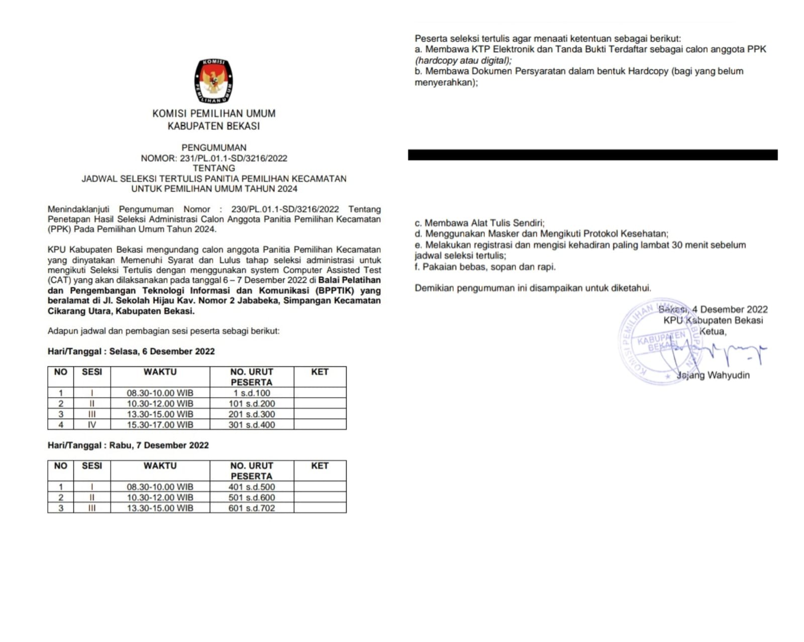 BERIKUT PENGUMUMAN JADWAL SELEKSI TERTULIS PANITIA PEMILIHAN KECAMATAN (PPK) UNTUK PEMILIHAN UMUM TAHUN 2024 DI KABUOPATEN BEKASI. SELENGKAPNYA UNDUH DISINI