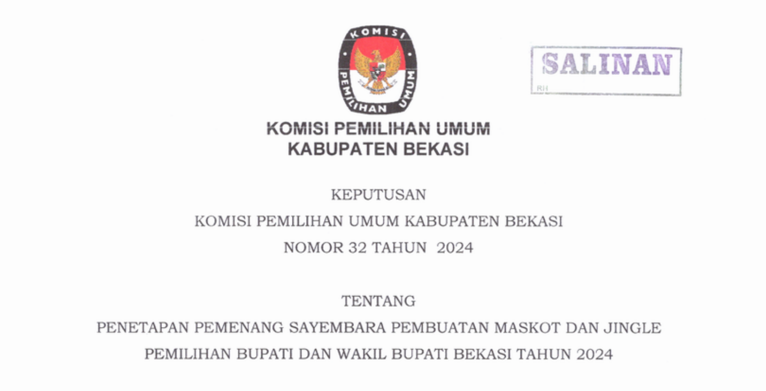 PENGUMUMAN PEMENANG SAYEMBARA MASKOT DAN JINGLE PEMILIHAN BUPATI DAN WAKIL BUPATI BEKASI TAHUN 2024 Rabu, 08 Mei 2024 07:00 74 Selengkapnya pengumuman dapat diunduh disini: 2024kpt32 Bagikan: Dilihat 74 Kali.