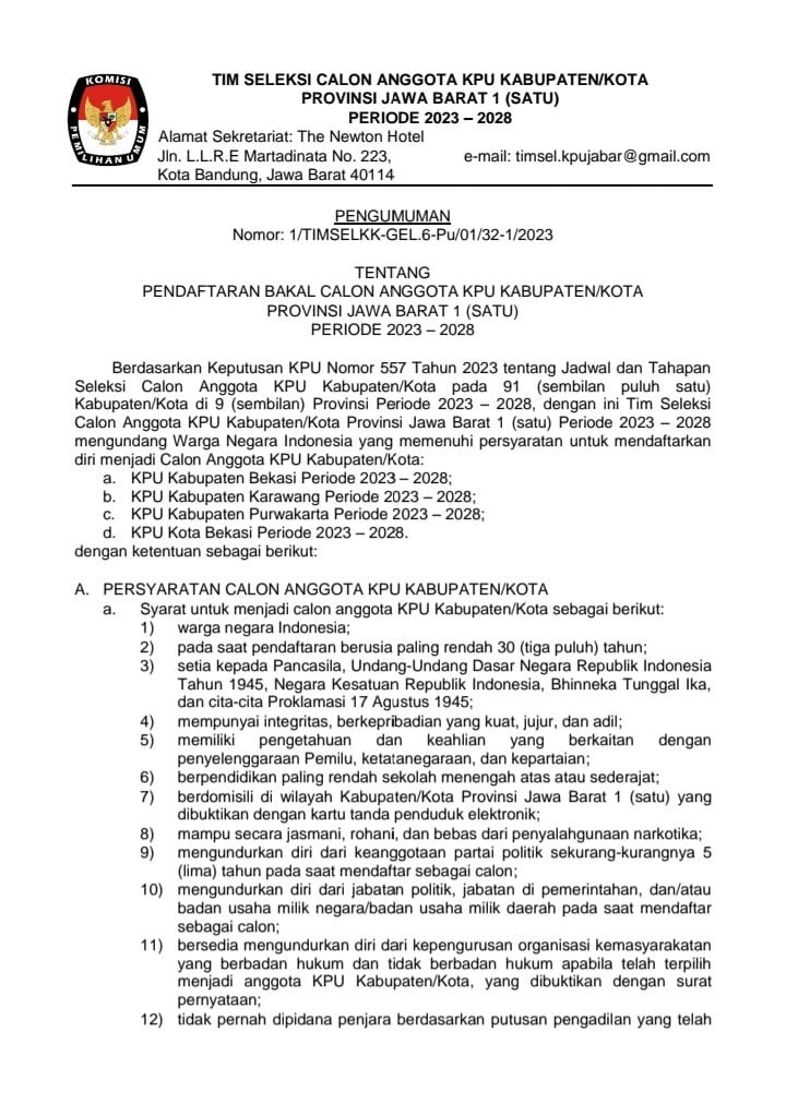 Calon Anggota KPU Kabupaten/Kota Provinsi Jawa Barat 1 (satu) Periode 2023 – 2028