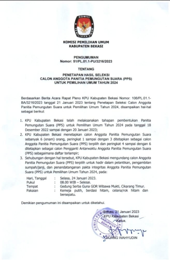 Berdasarkan Berita Acara Rapat Pleno KPU Kabupaten Bekasi Nomor: 106/PL.01.1- BA/3216/2023 tanggal 21 Januari 2023 tentang Penetapan Seleksi Calon Anggota Panitia Pemungutan Suara (PPS) pada Pemilihan Umum Tahun 2024.