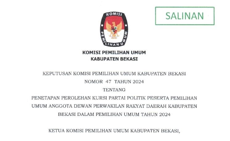 #TemanPemilih Berikut kami sampaikan Keputusan Komisi Pemilihan Umum Kabupaten Bekasi Nomor 47 Tahun 2024 Tentang Penetapan Perolehan Kursi Partai Politik Peserta Pemilihan Umum Anggota Dewan Perwakilan Rakyat Daerah Kabupaten Bekasi pada Pemilihan Umum Tahun 2024, dan Keputusan Komisi Pemilihan Umum Kabupaten Bekasi Nomor 48 Tahun 2024 Tentang Penetapan Calon Terpilih Anggota Dewan Perwakilan Rakyat Daerah Kabupaten Bekasi pada Pemilihan Umum Tahun 2024, serta Keputusan Komisi Pemilihan Umum Kabupaten Bekasi Nomor 49 Tahun 2024 Tentang Perubahan Atas Keputusan Komisi Pemilihan Umum Kabupaten Bekasi Nomor 48 Tahun 2024 Penetapan Calon Terpilih Anggota Dewan Perwakilan Rakyat Daerah Kabupaten Bekasi pada Pemilihan Umum Tahun 2024.