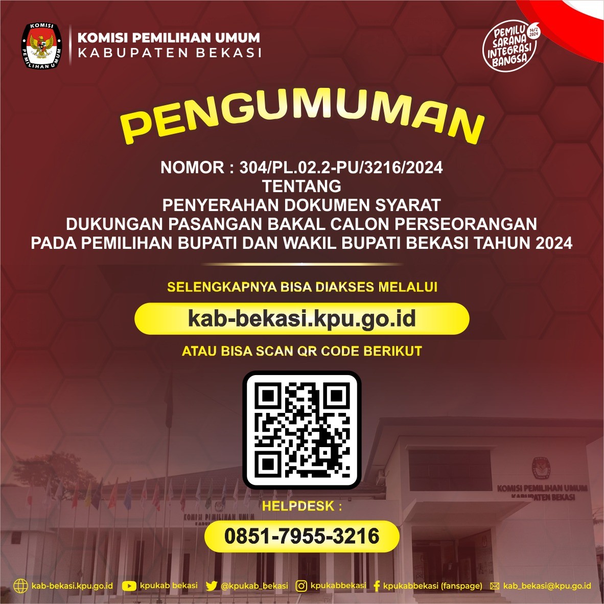 PENGUMUMAN PENYERAHAN DOKUMEN SYARAT DUKUNGAN PASANGAN BAKAL CALON PERSEORANGAN PADA PEMILIHAN BUPATI DAN WAKIL BUPATI BEKASI TAHUN 2024