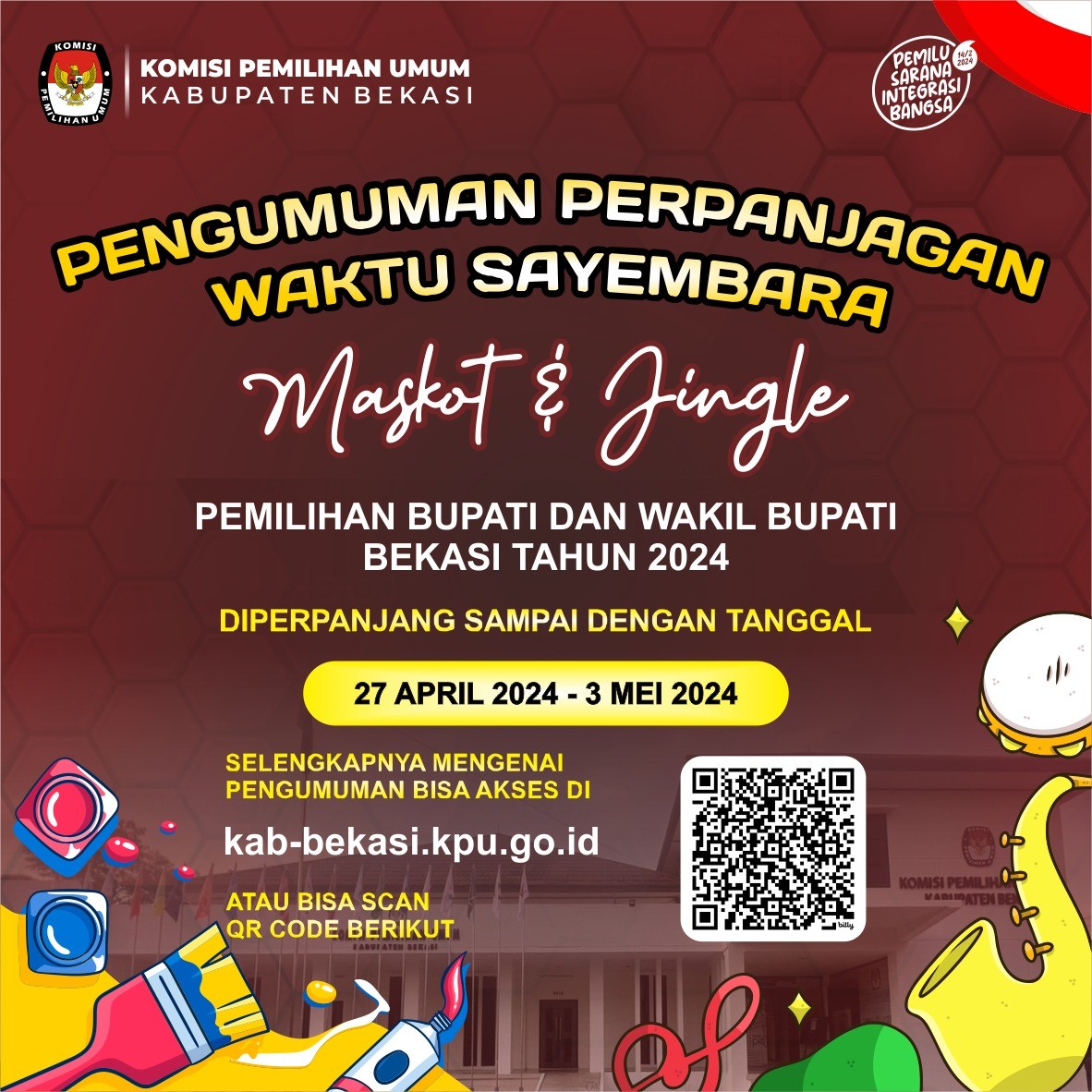Berdasarkan Peraturan Komisi Pemilihan Umum Nomor 2 Tahun 2024 tentang Tahapan dan Jadwal Pemilihan Gubernur dan Wakil Gubernur, Bupati dan Wakil Bupati, serta Walikota dan Wakil Walikota Tahun 2024, dan berdasarkan Surat Dinas KPU Provinsi Jawa Barat Nomor 245/PP.06.1-SD/32/2024 tanggal 21 April 2024 Perihal Perpanjangan Waktu Sayembara Jingle dan Maskot Pemilihan Kepala Daerah Serentak Tahun 2024, dengan ini KPU Kabupaten Bekasi mengadakan Perpanjangan Sayembara Maskot dan Jingle Pemilihan Bupati dan Wakil Bupati Bekasi Tahun 2024 dengan ketentuan sebagai berikut: