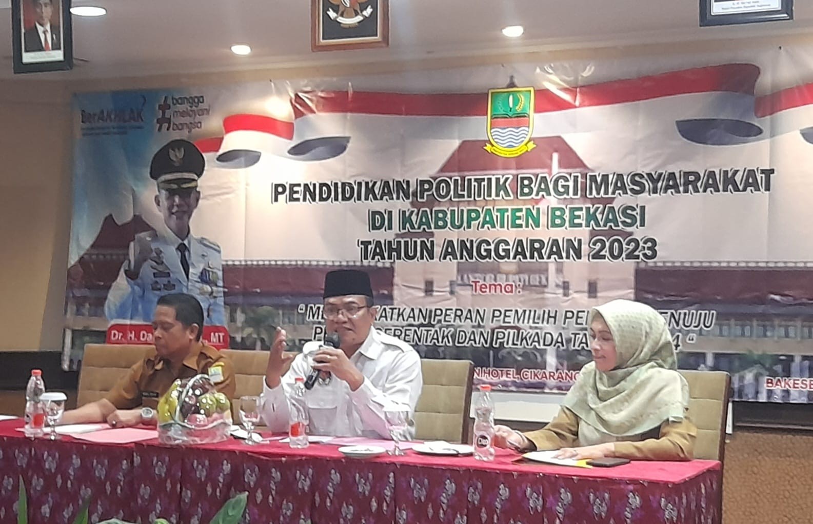 Kadiv Sosdiklih, Parmas dan SDM pada KPU Kabupaten Bekasi, Dhany Wahab Habieby menyerukan hal tersebut dalam acara Pendidikan Politik Bagi Masyarakat yang diadakan oleh Bakesbangpol Kabupaten Bekasi, Senin (13/3/2024) di Hotel Citra Inn, Cikarang.