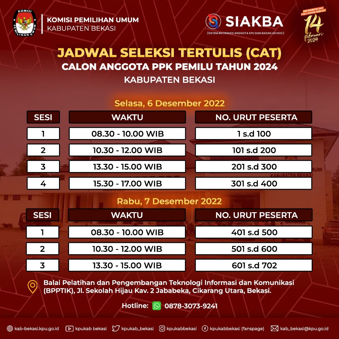 Jajang menambahkan, para calon anggota PPK selanjutnya akan menjalani tahap seleksi tertulis dengan metode computer assisted test (CAT) pada tanggal 6 – 7 Desember 2022 bertempat di Balai Pelatihan dan Pengembangan Teknologi Informasi dan Komunikasi (BPPTIK), Jalan Sekolah Hijau Kav. Nomor 2 Jababeka, Simpangan, Kecamatan Cikarang Utara, Kabupaten Bekasi.