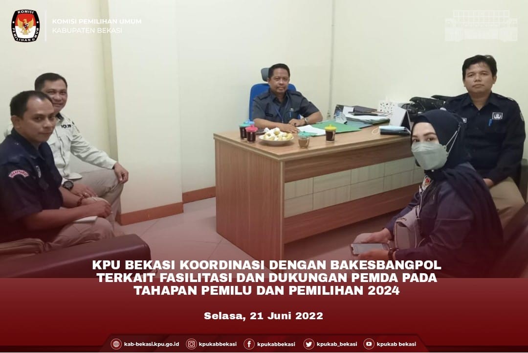 “Kami melakukan koordinasi dengan Bakesbangpol sesuai arahan Ketua KPU Kabupaten Bekasi untuk menindaklanjuti pesan Bapak Pj Bupati. Dukungan dan fasilitasi dari pemerintah daerah kami harapkan terkait penyediaan sarana dan prasarana perkantoran untuk kelancaran tugas penyelenggaraan pemilu, “ ucap Wahid.